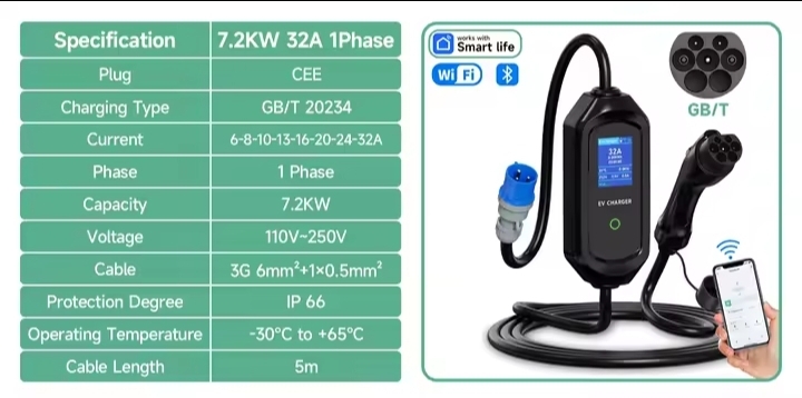 Зарядка до електромобіля, електрички GB/T, GBT, ГБТ 32A, 7.2кВт, 5м арт.1040